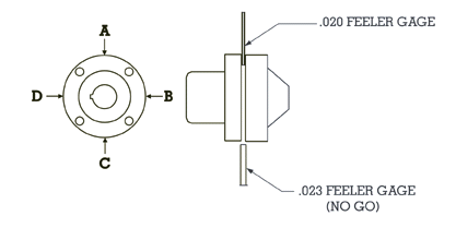 B, C, and D. If the .023” feeler gage will not go between the flanges